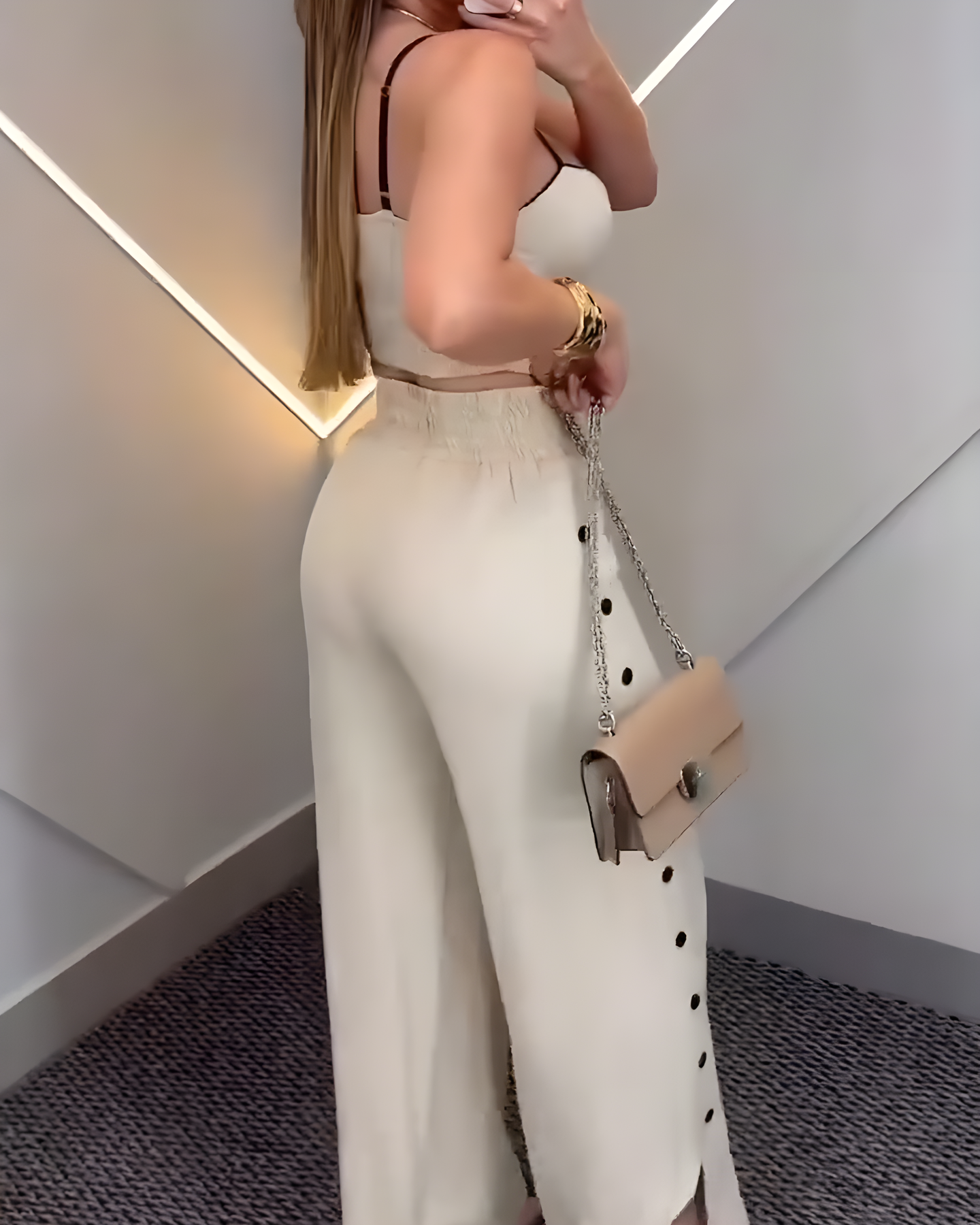 Przyciągaj spojrzenia w Seksownym Zestawie Dwuczęściowym z Szelkami i Szerokimi Spodniami z Elastycznym Pasem, stworzonym dla pewnych siebie kobiet, które kochają styl i wygodę. Idealny na codzienne wyjścia, imprezy czy wieczorne spotkania – łączy nowoczesną elegancję z nutą zmysłowości.