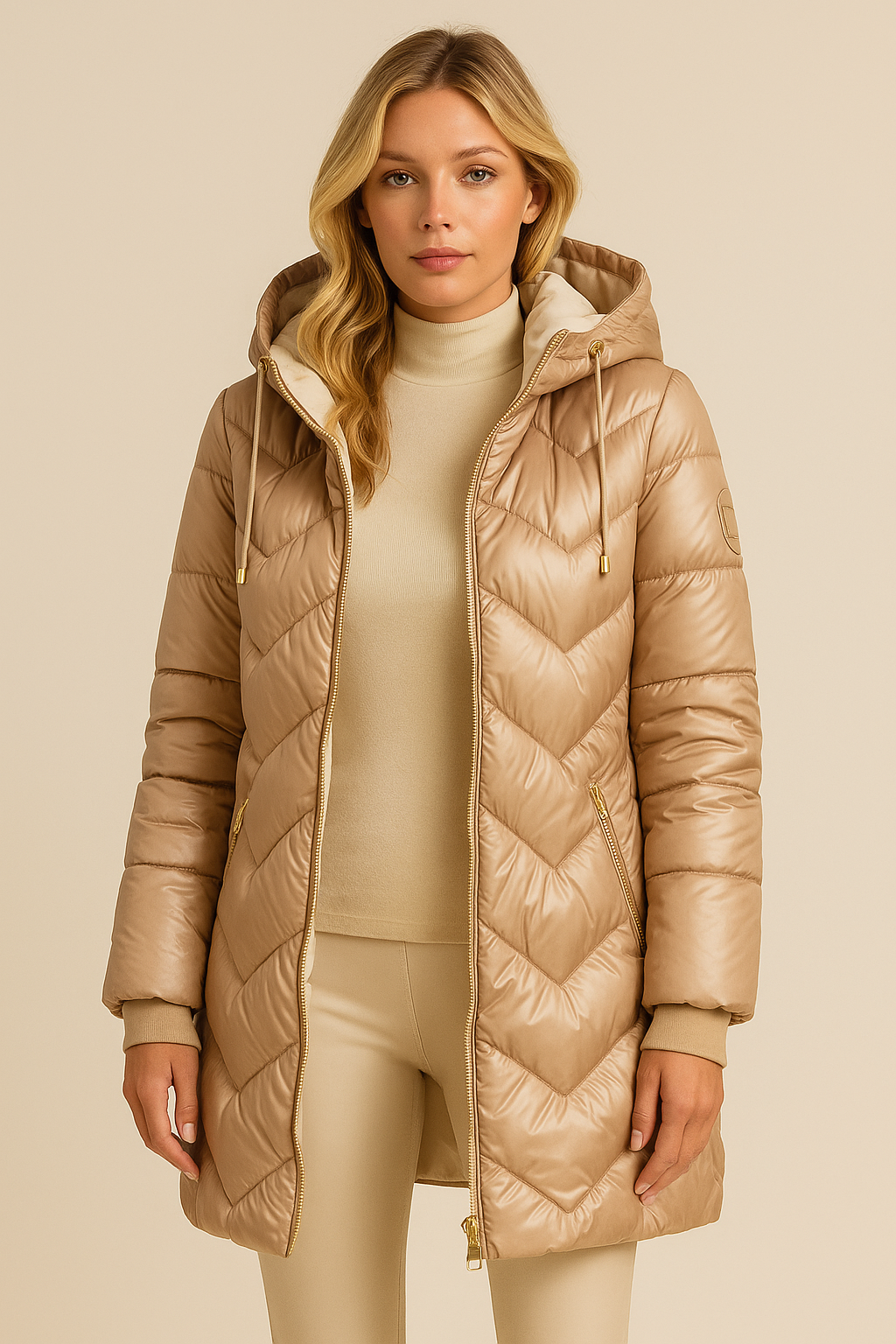 Zintegrowany kaptur chroni przed wiatrem i deszczem, zachowując jednocześnie szyk i lekkość formy. To idealne połączenie funkcjonalności z elegancją.