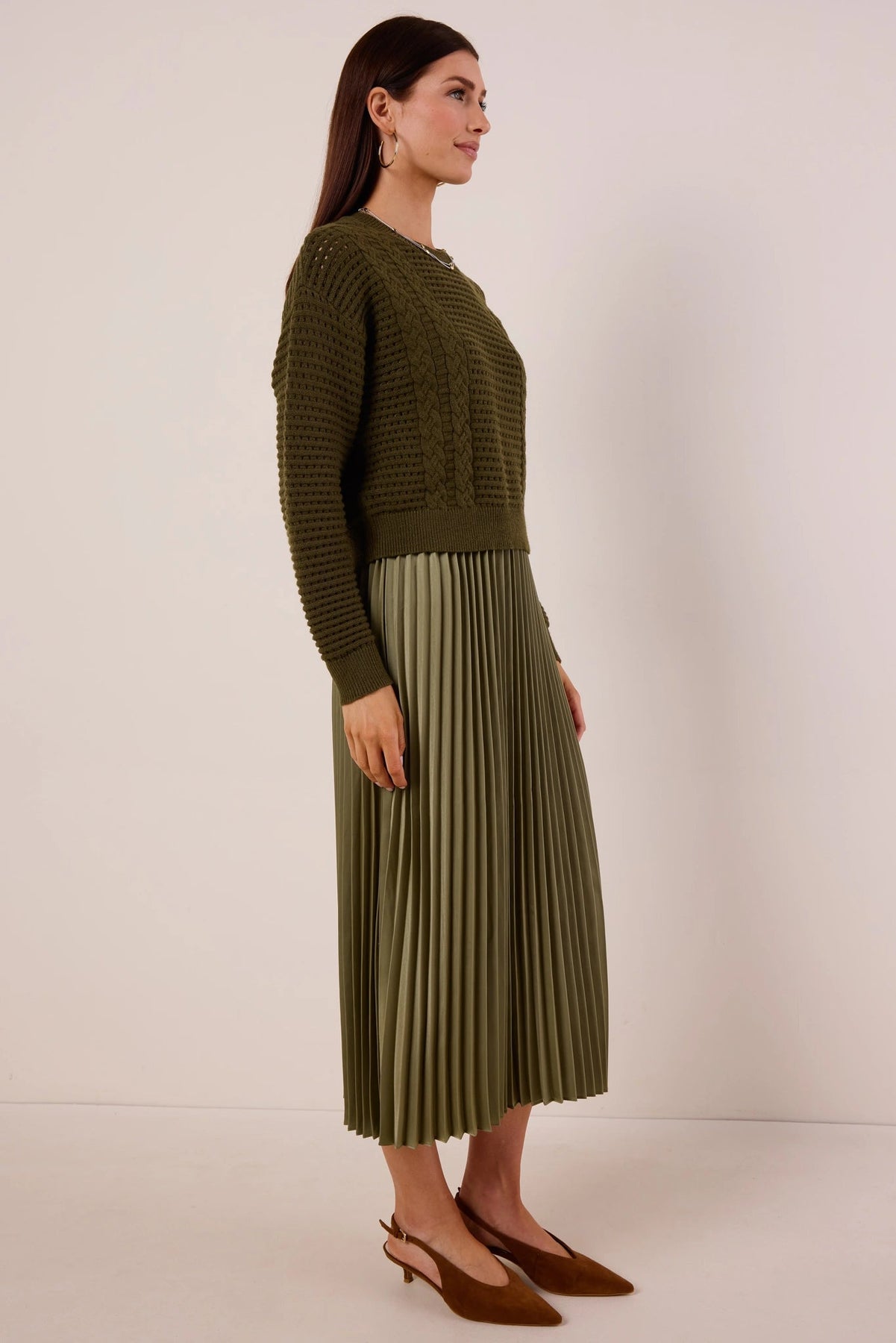 Sukienka Gabbie w kolorze oliwkowym to idealne połączenie elegancji i codziennej wygody. Wykonana z miękkiej, oddychającej tkaniny, podkreśla sylwetkę dzięki swobodnemu, a jednocześnie kobiecemu krojowi. Oliwkowy odcień nadaje jej ponadczasowego, naturalnego charakteru, dzięki czemu sprawdzi się zarówno na co dzień, jak i na wyjątkowe okazje. Możesz nosić ją z sandałami w luźnym stylu lub ze szpilkami, aby stworzyć bardziej elegancki look.